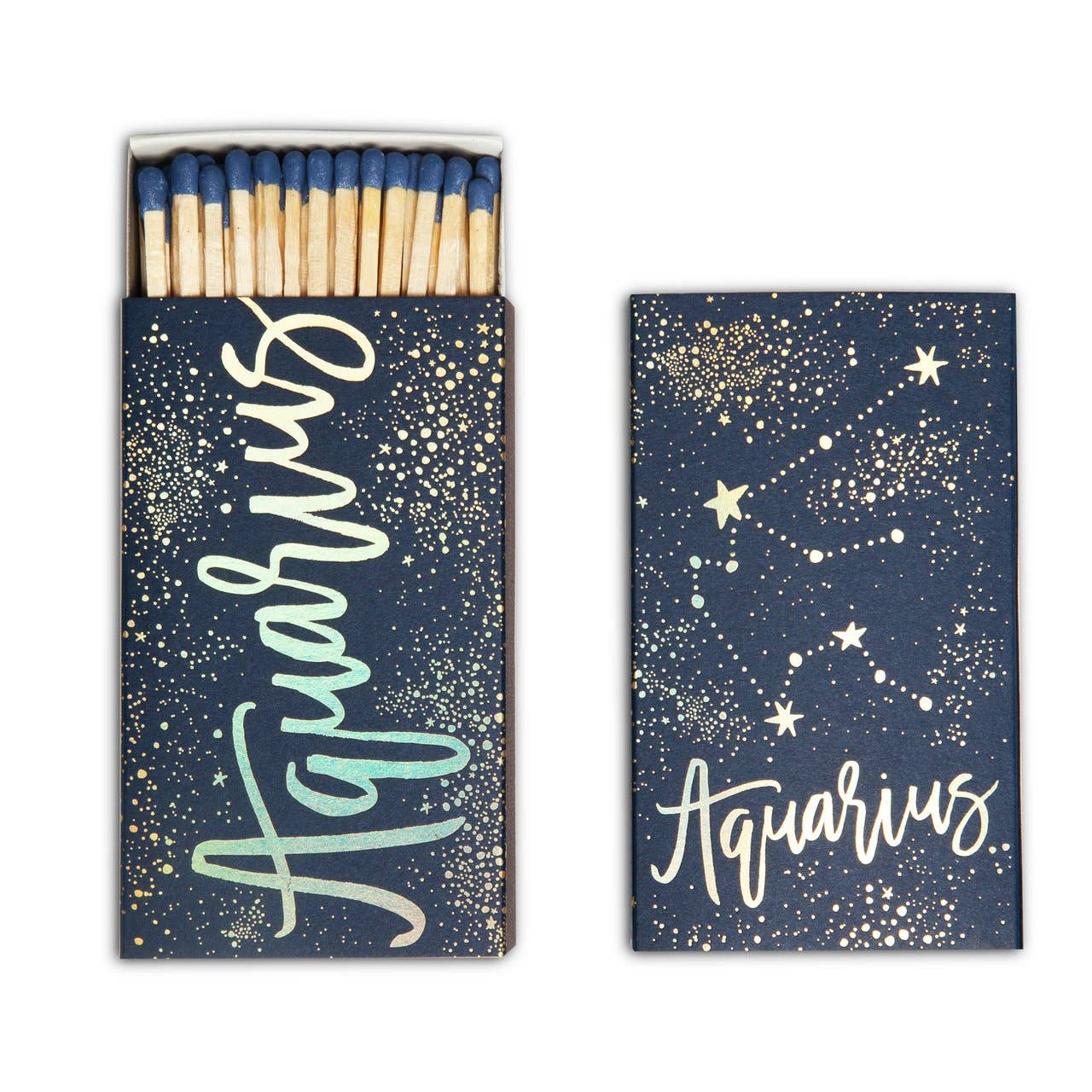 Aquarius - January 20 to February 18. Front/Back: "Aquarius". Printing: Gold Hologram Foil, Navy Stock. Matchbox size: 4.5" x 2.5" x .75". 60 matches tipped in Dark Blue.