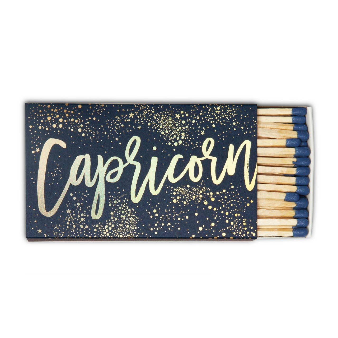 Capricorn - December 22 to January 19. Front/Back: "Capricorn". Printing: Gold Hologram Foil, Navy Stock. Matchbox size: 4.5" x 2.5" x .75". 60 matches tipped in Dark Blue.
