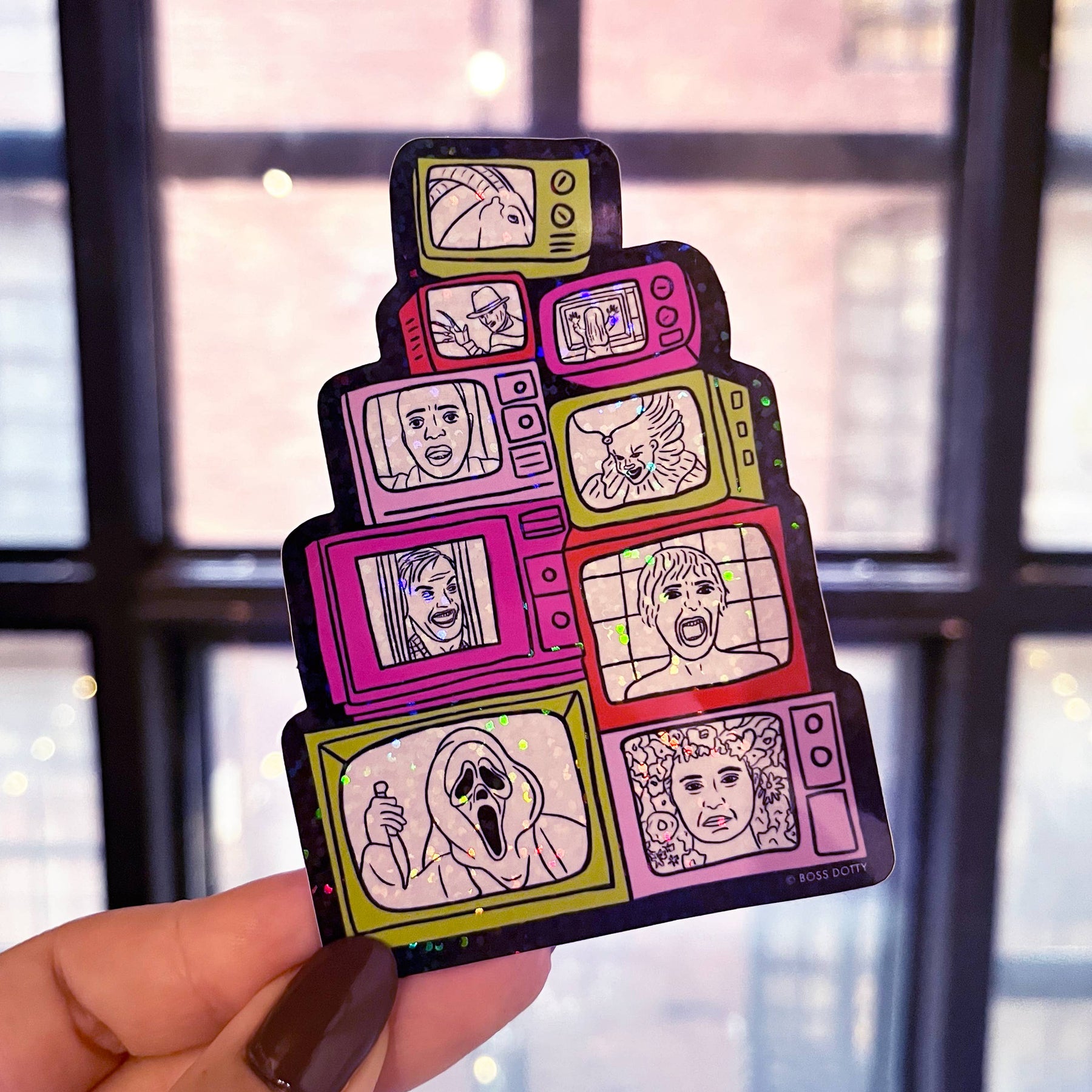 • 4" tall sticker • PVC-free glitter finish with glossy laminate • resistant to the sun and water • ships without plastic packaging • perfect for Halloween and year-round horror film lovers!