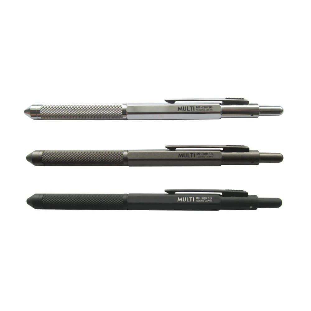 A multi-functioning ballpoint pen with two colors and a mechanical pencil option by OHTO.
