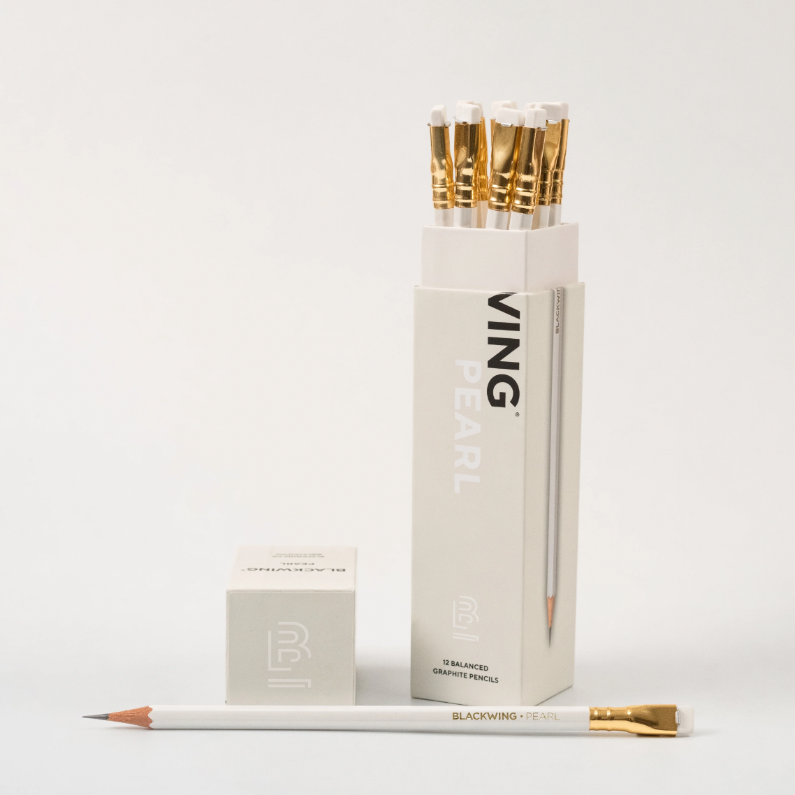 A favorite of calligraphers and illustrators, the Blackwing Pearl includes a balanced and smooth graphite core that is softer than the graphite found in the Blackwing 602, but firmer than the graphite found in the Blackwing Matte. Each pencil features a pearlescent white, pink, or blue finish, our iconic square Blackwing ferrule, and replaceable eraser.