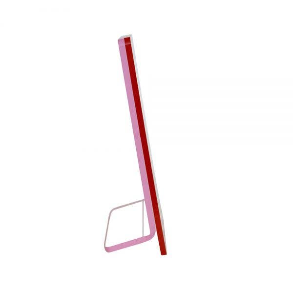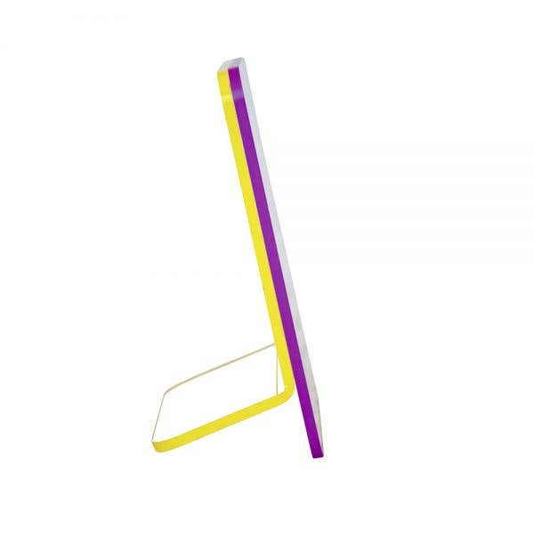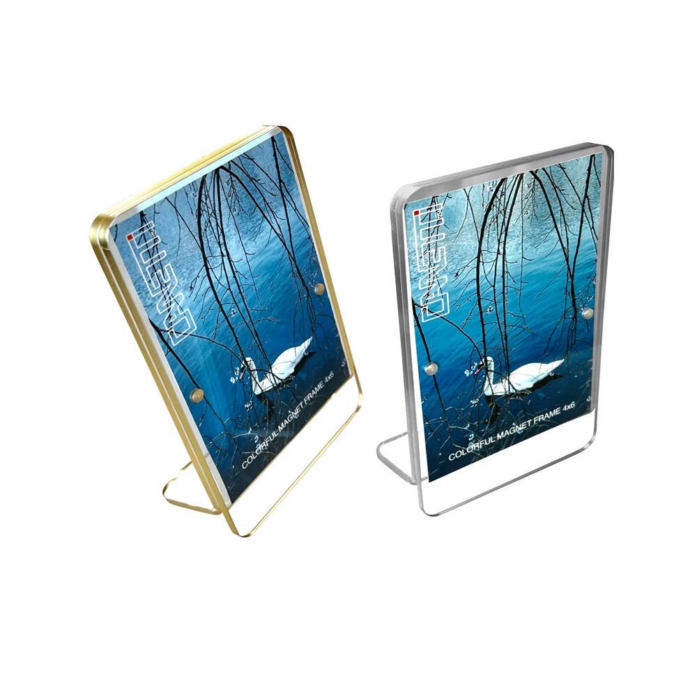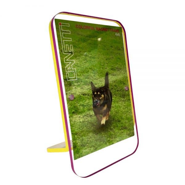 The Colorful Magnet Frame is comprised of two thin crystal clear acrylic panels, each one edged in a different bright color. The front panel is straight while the back panel has a bend, allowing it to stand on its own. Can be used in the vertical or horizontal position. Available now in 4”x 6” and 5″ x 7″ sizes in 10 bright colorful combinations. New Gold, Silver and White now in stock! In-house custom engraving available. Advise (1) Orientation of Frame, (2) Desired Position of Engraving, (3) Type: Block Lettering, Script, CAPS, Upper/lower case, (4) Custom Text. Contact us for more details.