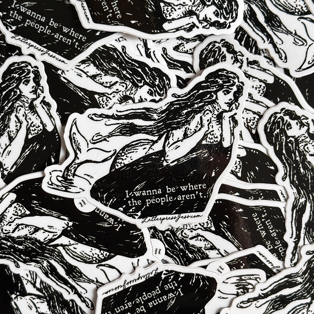 Vinyl sticker featuring Charles Dana Gibson's Gibson Girl illustration. Sticker reads: "I wanna be where the people aren't." Created by Letterpress Jess. Size: 3.2" x 3.3" Paper: Vinyl
