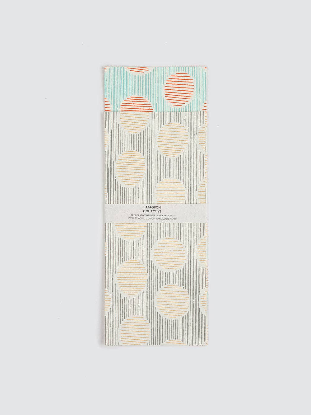 Set of two 14.5" x 11" printed wrapping paper in Mieko Flower print set or Shima Maru print set. Hand screen printed on up-cycled cotton pulp paper. Everything is hand made in India. Our paper products are made of up-cycled cotton waste from the garment manufacturers. Turning scraps into fine paper with a purpose. Any imperfections in the paper are inherent to the paper. Reuse and recycle. Love preloved.