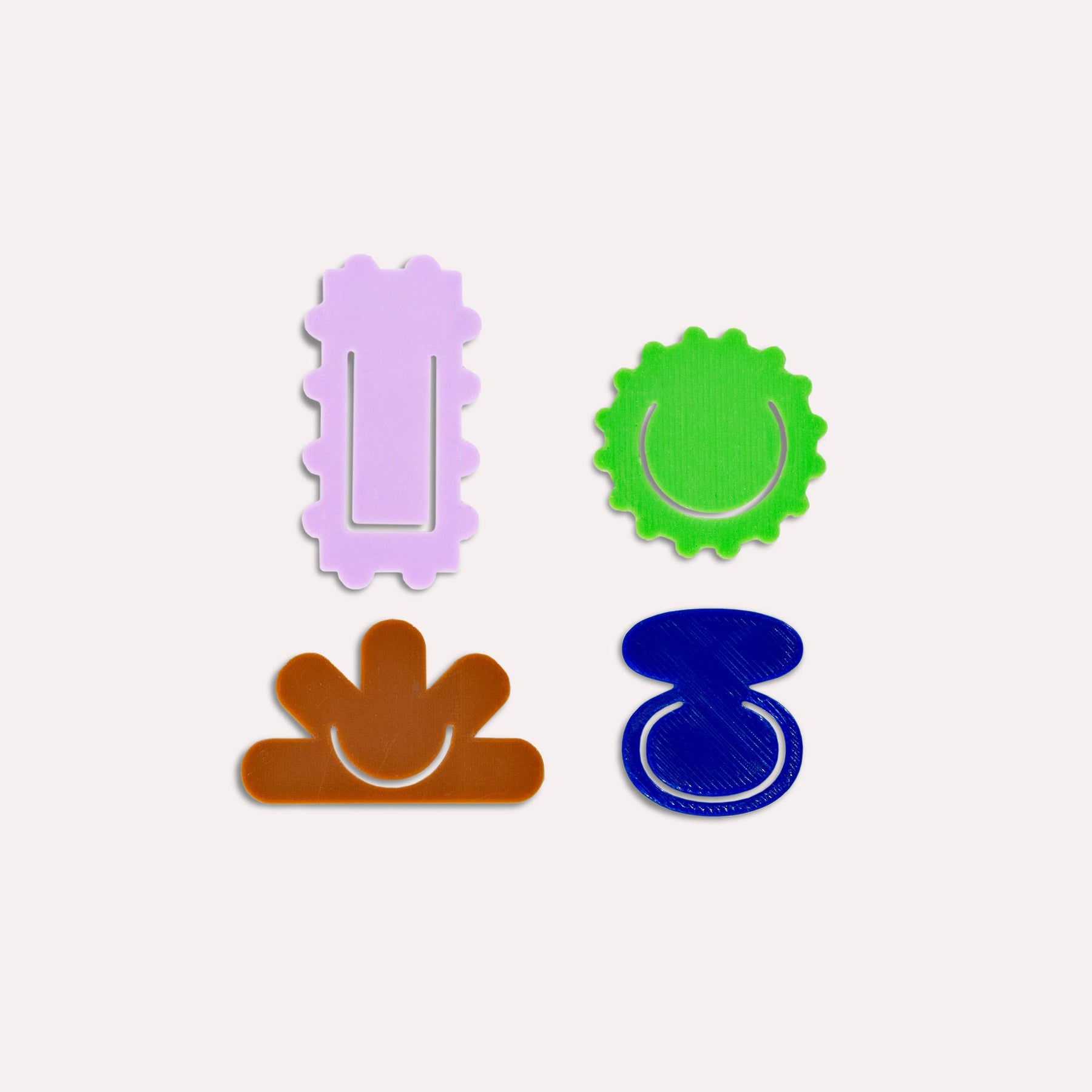 This translucent tab set is the perfect companion for your notebook or planner, to help you mark out important places in your book. Or just to look cute. It is 3D printed in-house by us in our studio. This tab set includes 1 of each of the following shapes: Stamp (5cm tall x 2.7cms wide) Flower (2.8cms tall x 4.5cms wide) Ovals (3.1cms tall x 2.7cms wide) Cog (3.4cms round) It comes packed in a biodegradable film bag with a backing card. Made in our studio in the UK.