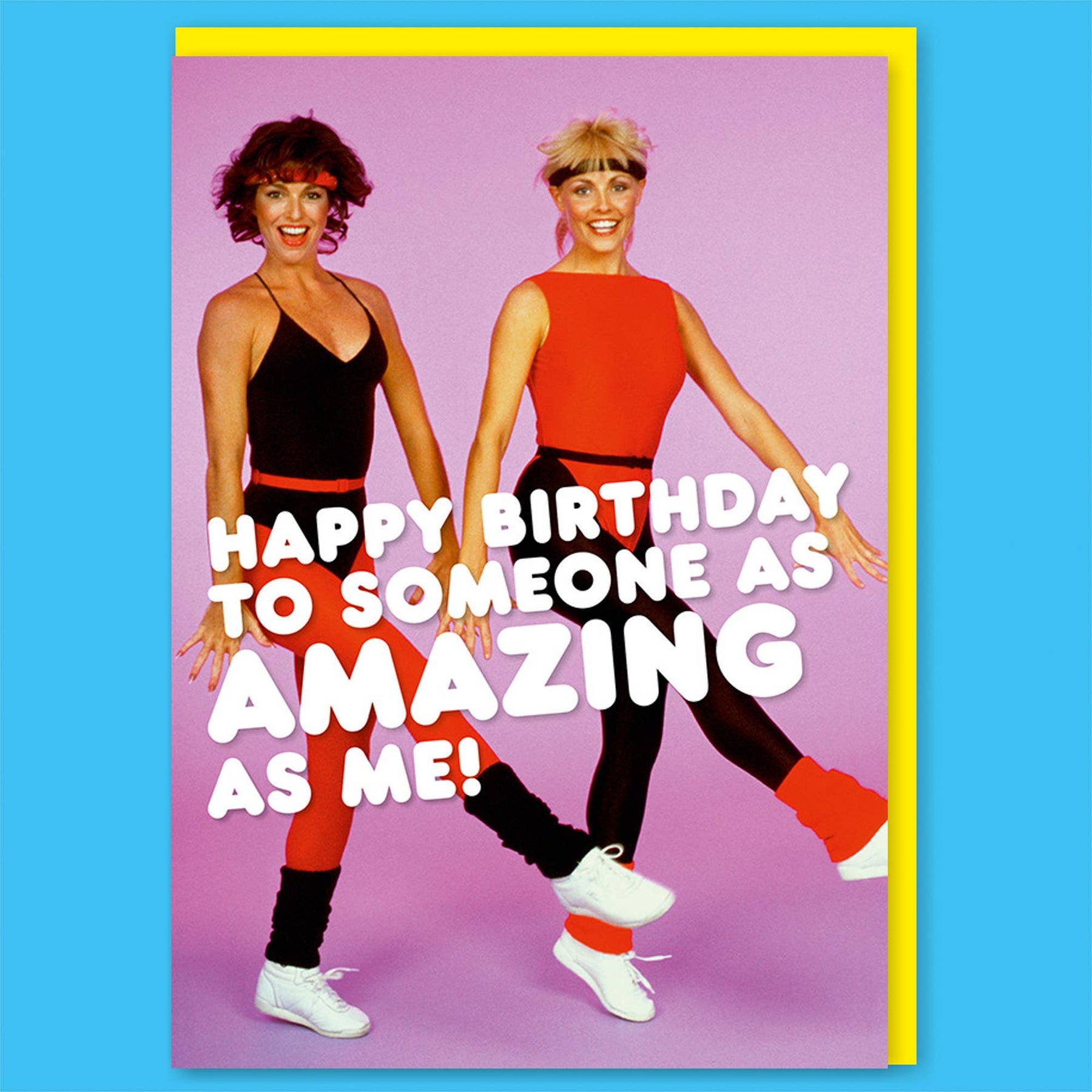 Here's a Birthday card for someone who is pretty special. Why? Because they must be pretty special to be as amazing as you! A birthday card with a 1980s picture of two woman exercising in leotards and leg warmers. White text in front of them reads Happy Birthday to someone as amazing as me!