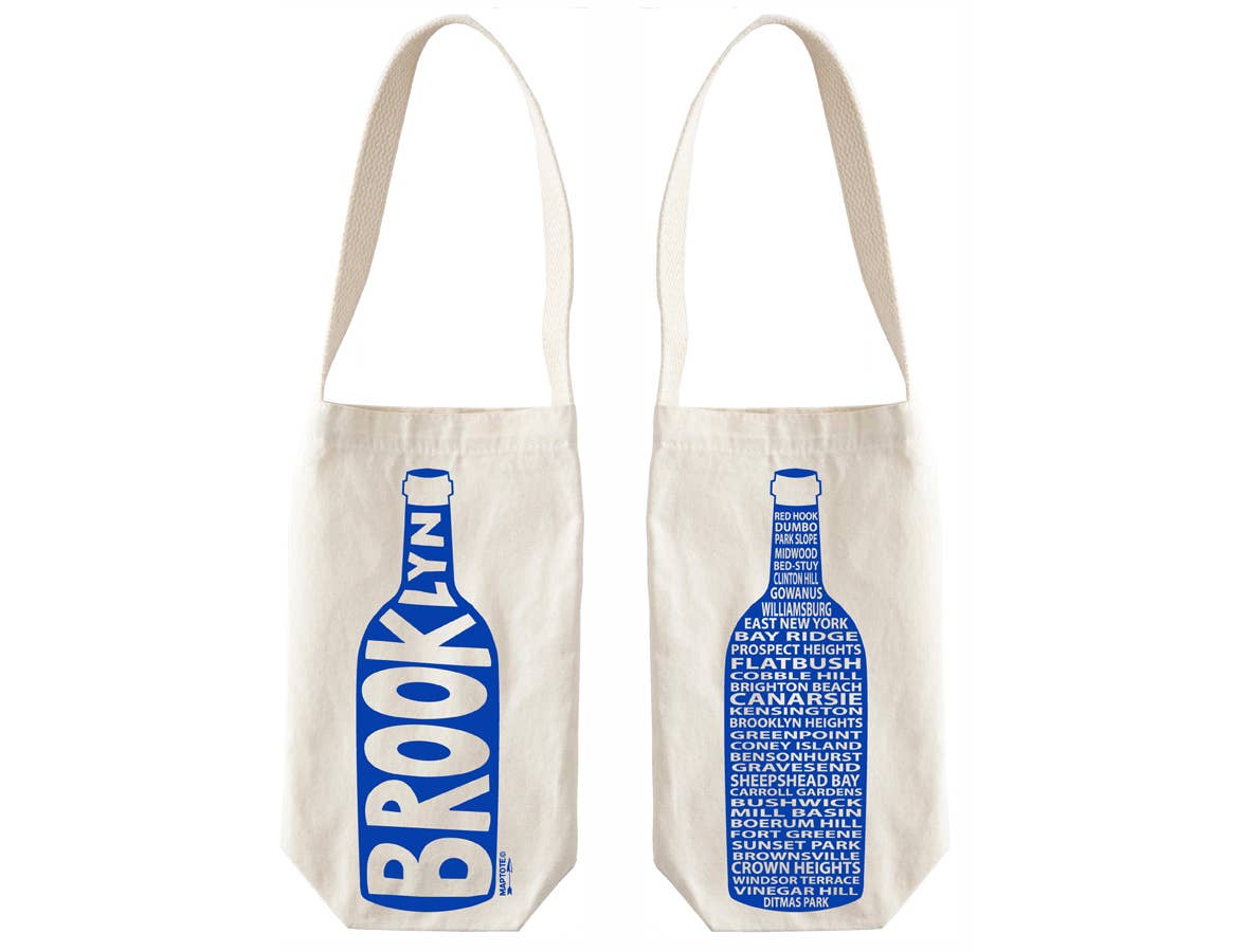 Perfectly fits a bottle of wine to create a unique gift. Arrive at your next dinner or housewarming party in style and repping Brooklyn, New York with our single wine tote. • Fun, double-sided print with your favorite city, state, or just to celebrate. • 7oz 100% natural cotton or 10oz 100% natural denim • Approximately 13" x 6.5" with 3" gusset and an 18" handle. • Made in Brooklyn, NY, USA.