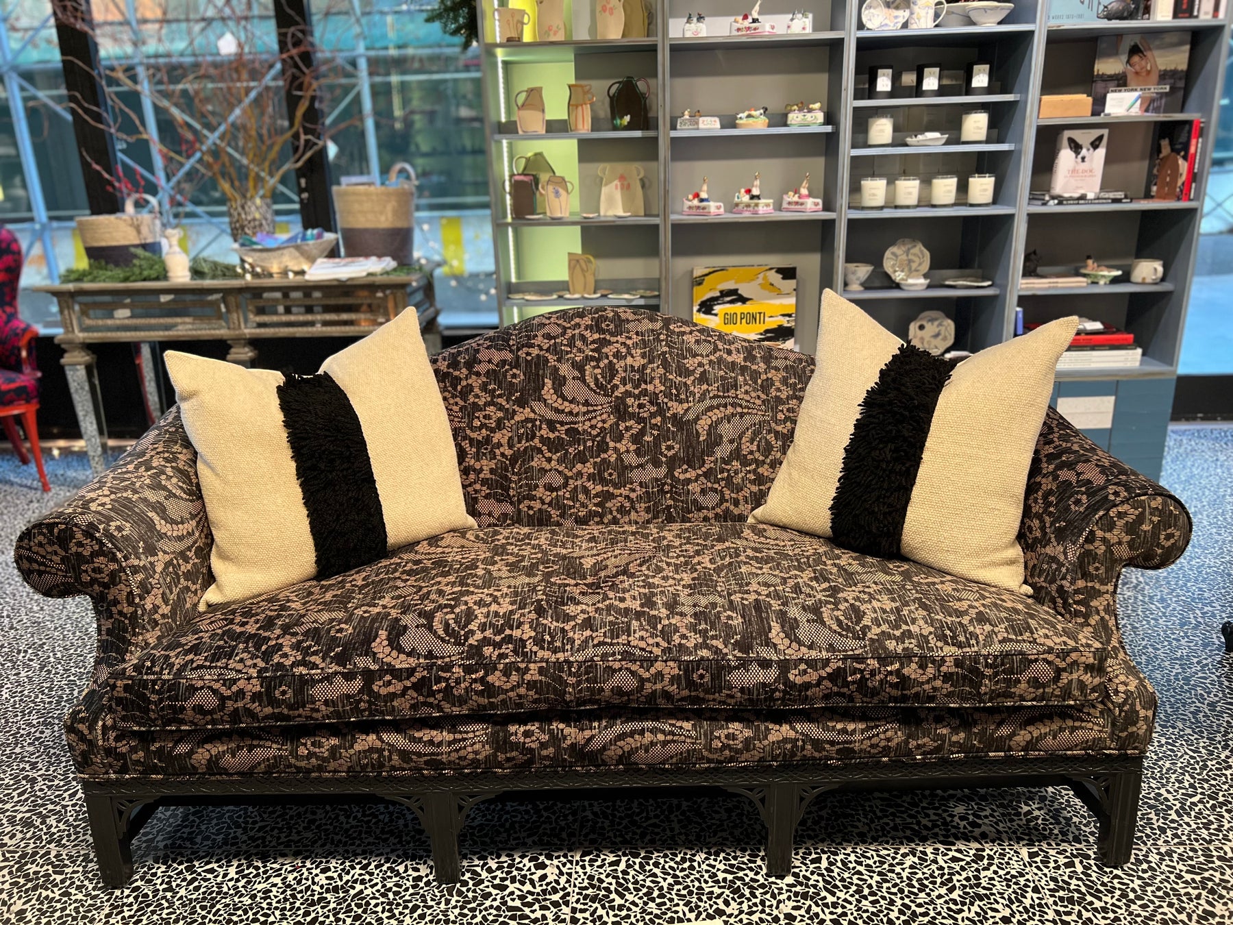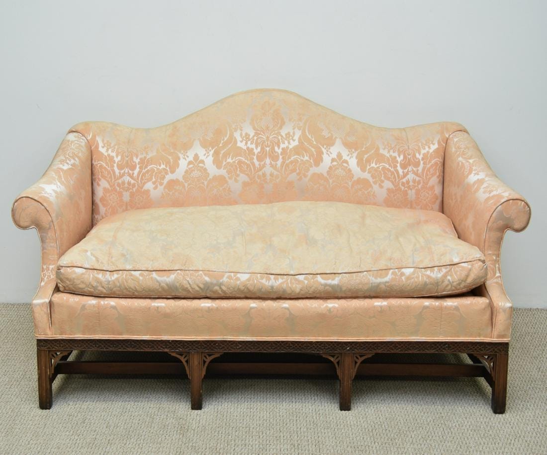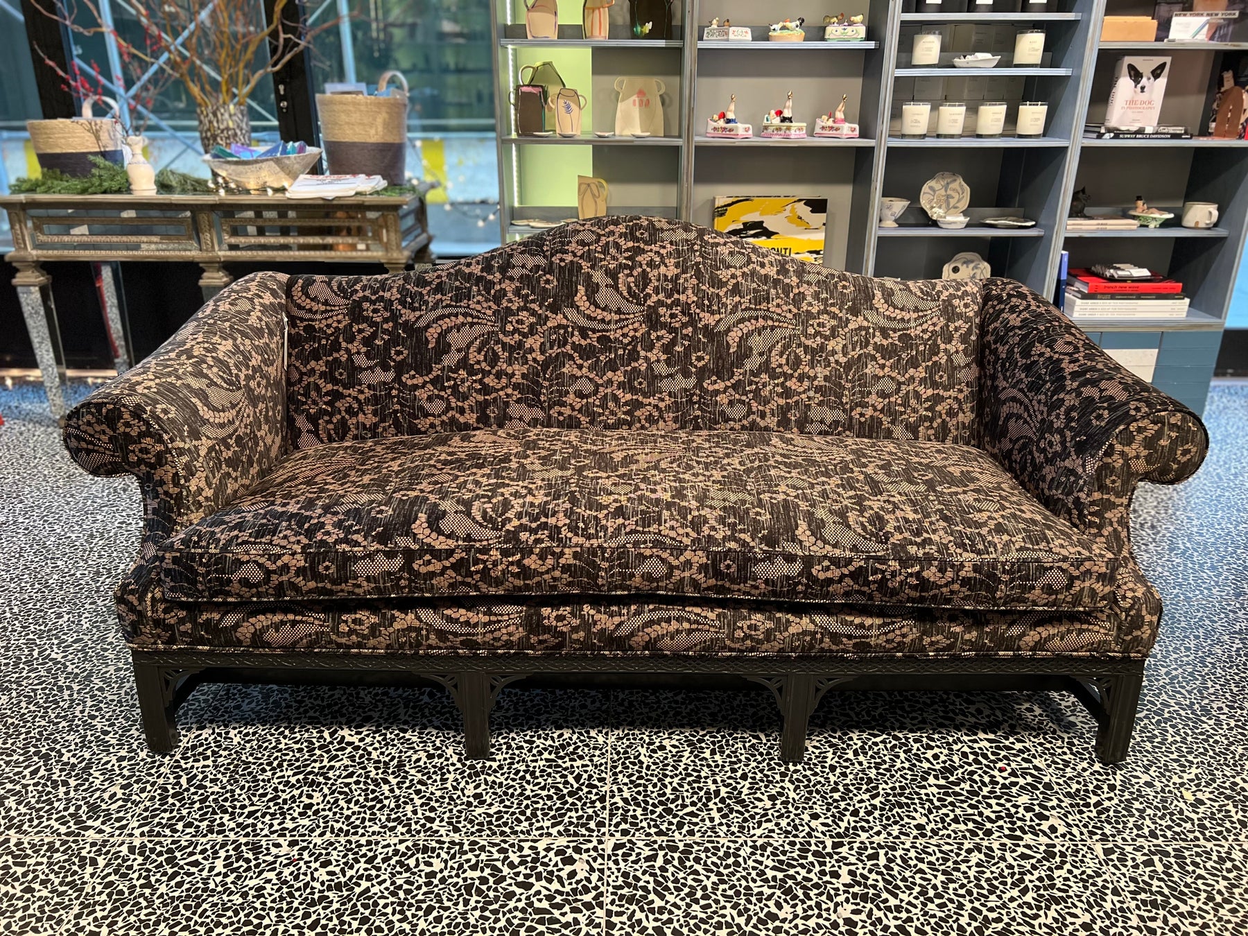 Chippendale style camelback sofa reupholstered and re-cushioned with Natasha Baradaran Elle Performance Velvet.  Painted with Benjamin Moore Deep indigo    100% poly; 100k Martindale.  with blind fretwork 31"h x 69"l x 22"d / seat height = 12.5