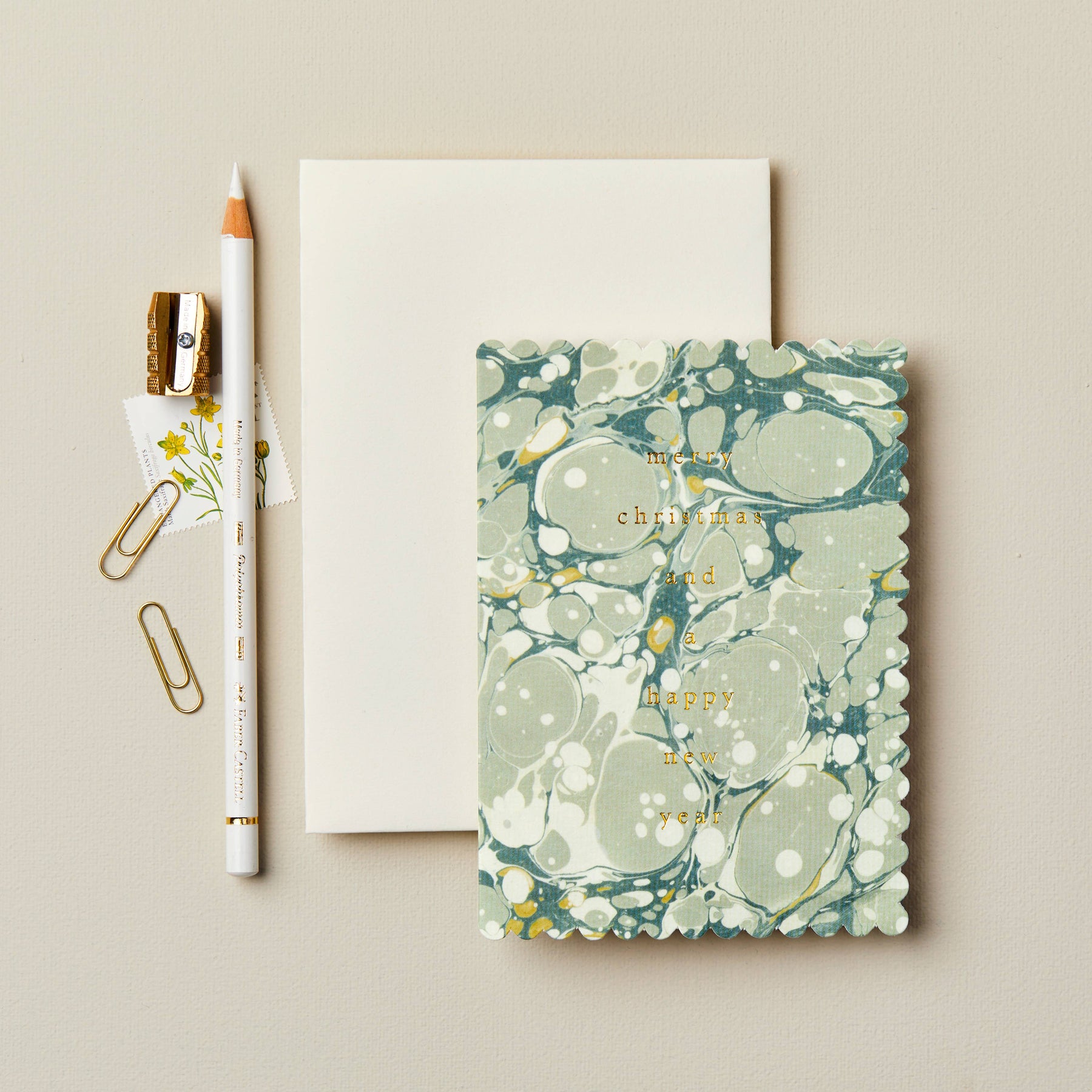 A marbled card in shades of green and cream with a die cut scalloped edge. This card reads 'Merry Christmas and a Happy New Year' and is decorated with golden foil. Paired with a luxury cream envelope. Designed and packed with care from our studio in Hove, England. Printed in the UK on FSC certified papers SKU WAN 4009