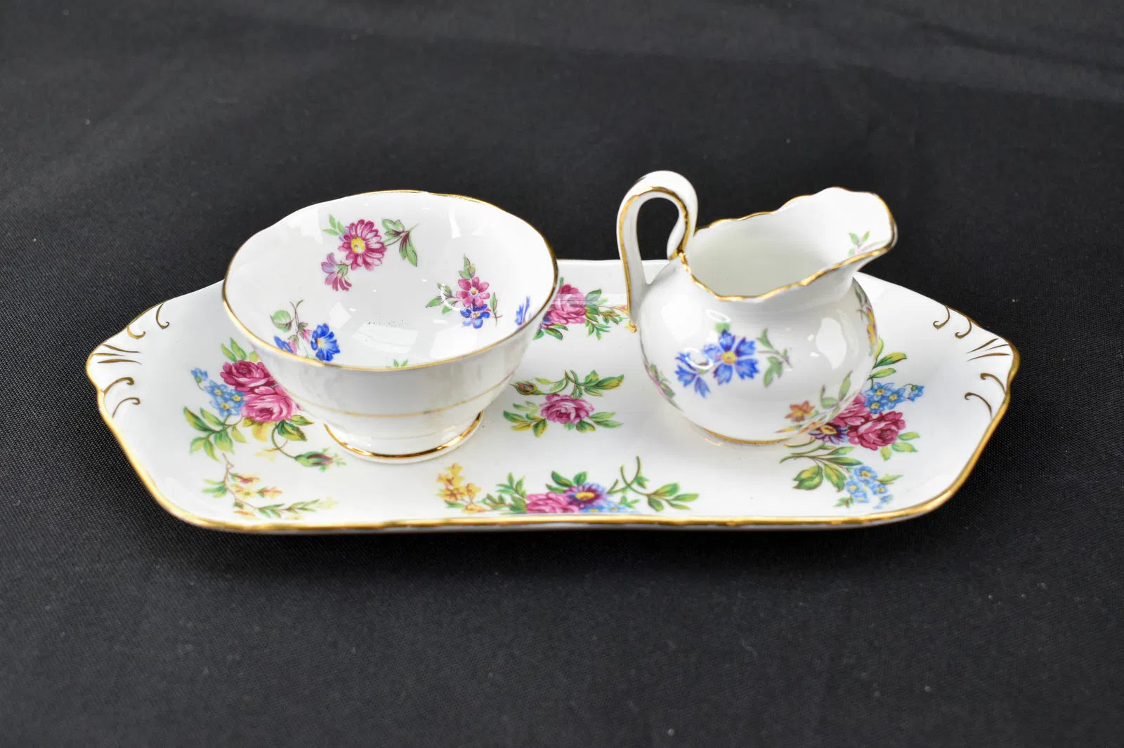 11 vintage ceramic pieces including a Swedish porcelain handled heather vessel by Hackefors, a small bone china Scilla bowl and jug by Shelley England, a bone china swan figure by Georgian, two small lidden bone china vessels by Hammersley, a Wild Strawberry bone china egg dish and plate by Wedgwood, and a small bone china bowl, jug, and tray by Royal Chelsea.