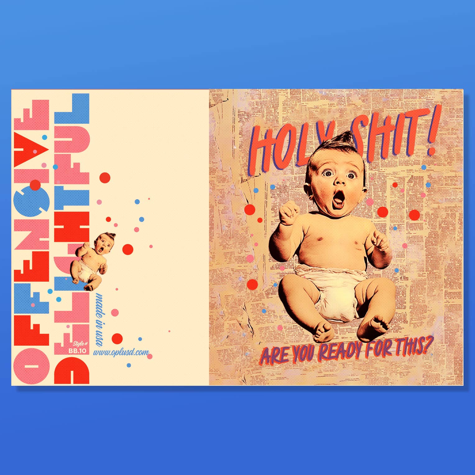Style No. BB.10 "HOLY SHIT! are you ready for this?" baby, surprise, good luck, congratulations, baby shower, new mom, new dad Baby Cards: Perfectly Snarky for New Parents. Bring some much-needed humor to your baby section with our bold and irreverent baby cards. These aren’t your average cutesy, pastel-hued greetings. They’re for parents who want to laugh through the chaos of sleepless nights and endless diaper changes. With a mix of sarcasm and heart, these cards are ideal for customers who appreciate honesty, humor, and a little edge when celebrating life’s big (and sometimes overwhelming) moments. Perfect for boutiques, gift shops, and stores catering to those who like their baby cards with a touch of attitude. Stock up and let your customers embrace the wild ride of parenthood in style.