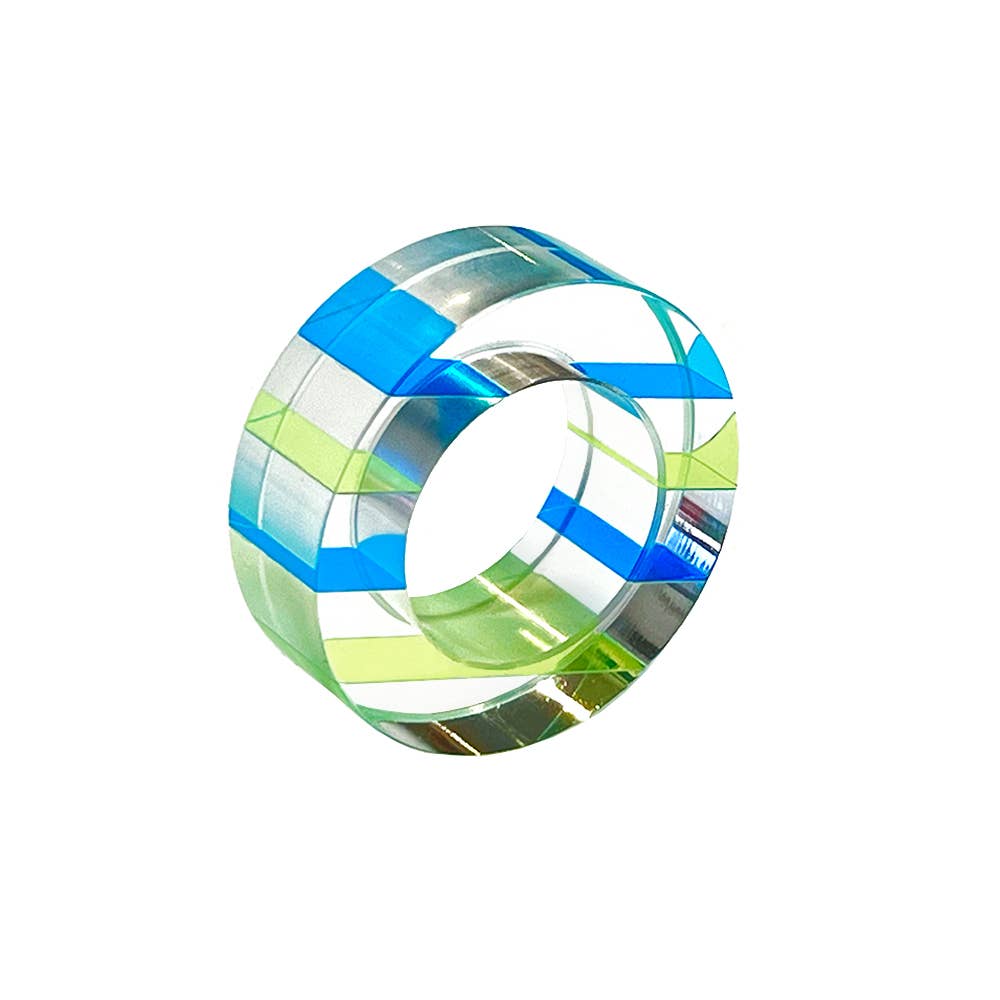 These lively, unique Napkin Rings adapt to any table setting. They come in a set of four pieces and are 2" wide. Safe, shatterproof layered acrylic, made with a unique process of layered acrylic. Easy to care for, simply wipe if necessary with a soft, damp cloth. Available in 4 color combinations in Square or Round. Galactic purple-blue layers for a stellar style, sunny yellow-orange slices to brighten your space, oceanic blue-green make a decorative splash, and deep red-orange hues that will glow through the home. Complete your table set and house decor with CANETTI® Napkin Rings, Vase, and Candle Holders. Do not put Napkin Rings in dishwasher.