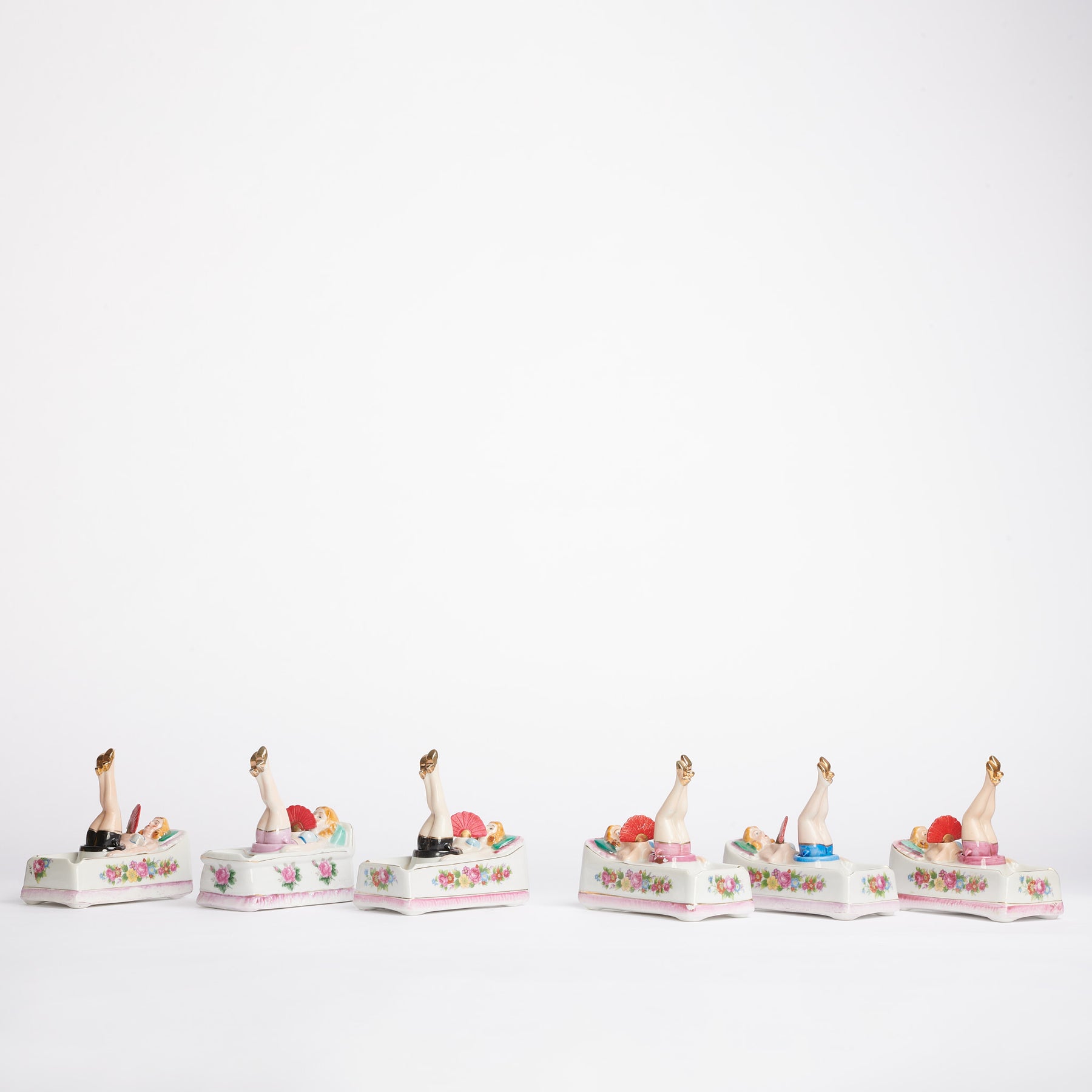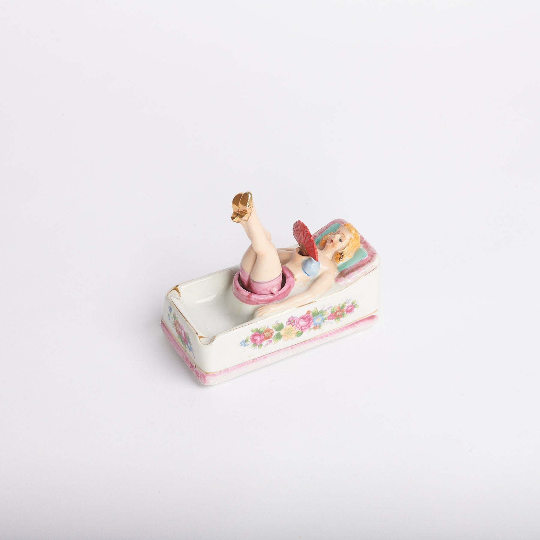 Vintage Ash Trays made in Japan in the 40s and 50s for the American export market. Hard to find with all three pieces intact: base, legs and fan. These delightful sunbathing ladies are a fun and whimsical piece of history. Porcelain. Each is a unique, vintage piece and will vary slightly from the pictured version.