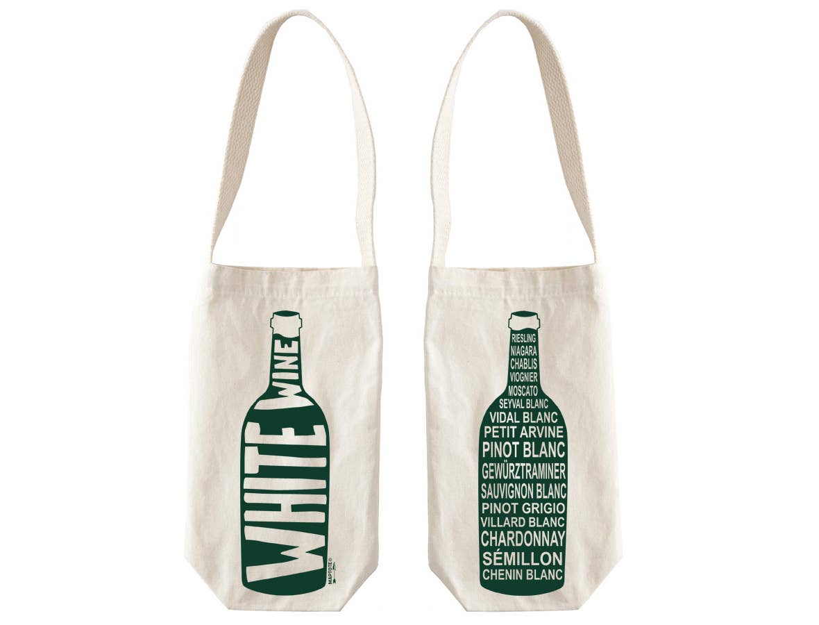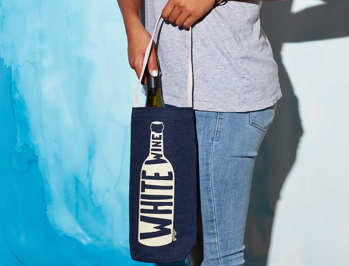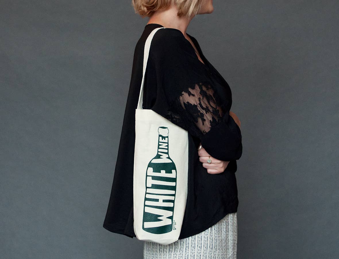 Perfectly fits a bottle of wine to create a unique gift. Arrive at your next dinner or housewarming party in style and ready to sip some white wine with our single wine tote. • Fun, double-sided print with your favorite city, state, or just to celebrate. • 7oz 100% natural cotton or 10oz 100% natural denim • Approximately 13" x 6.5" with 3" gusset and an 18" handle. • Made in Brooklyn, NY, USA.
